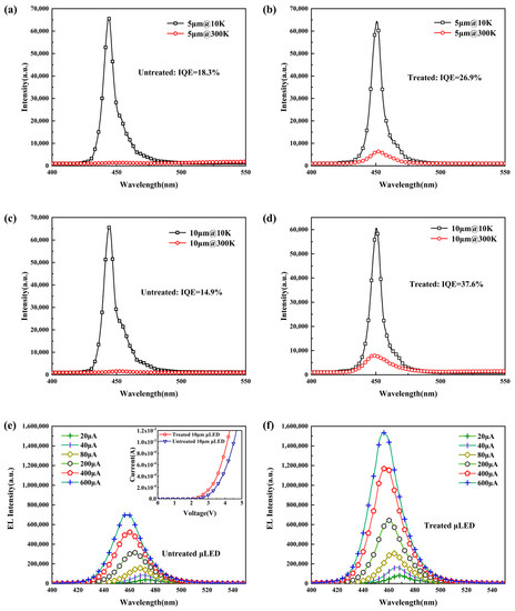 Figure 3a–d shows the temperature-dependent PL (TDPL) spectra of 5 μm and 10 μm Micro-LEDs with and without passivation. For 5 μm Micro-LED without passivation, IQE is only 18.3%. After passivation, the IQE was increased to 26.9%. Meanwhile, for 10 μm Micro-LED, the IQE was increased from 14.9% to 37.6% after passivation. It is clear that the optimized passivation process could greatly increase the IQE of Micro-LEDs. It is because the passivation treatment could effectively inhibit the non-radiative recombination of carriers in the Micro-LED, leading to the improvement the radiative recombination efficiency of the carriers in the active region. Thus, optimized passivation process is very helpful for improvement of the device performance and expanding the applications of Micro-LED.