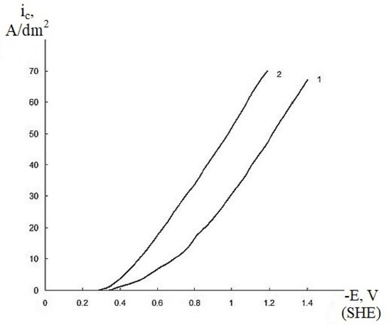 Potentiodynamic polarization curves of deposition of nickel–chromium alloy: 1—without additive; 2—together with graphene oxide (potential sweep rate Vs = 8 mV/s).
