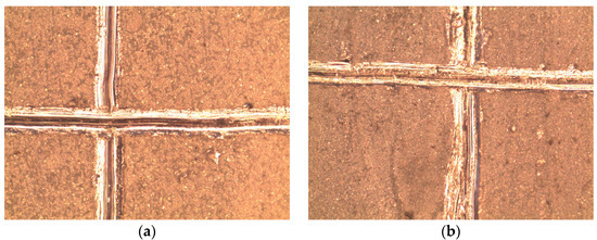 SEM images show that the transition from a pure nickel–chromium alloy (Figure 3a) to a nickel–chromium–GO CEC (Figure 3b) noticeably changes the surface microtopography. The composite coating has an ordered fine-grained structure as compared to a pure alloy. The CEC is dense and uniform, whereas on a nickel–chromium alloy without a dispersed phase, microcracks are observed. Probably, graphene oxide particles on the cathode surface act as crystallization centers, determining the formation and further growth of the electrolytic deposit. It should be noted that nickel–chromium–GO CECs are dense and uniform. When applying a grid of scratches, it was found that all the control samples (both pure nickel–chromium alloys and CECs) did not peel off the coatings from the metal base (Figure 4). The addition of graphene oxide in the nickel–chromium matrix did not worsen the adhesion of the forming coatings, regardless of the current density at which they were deposited.