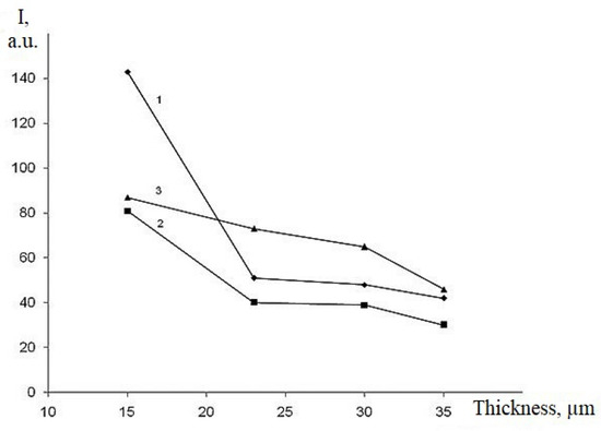 The addition of a dispersed phase into a galvanic coating results in the change of not only its composition and structure, but also of its operational properties. In practical terms, the physical and mechanical characteristics of metal surfaces, in particular their microhardness, are of significant interest. The study of nickel–chromium–GO CECs by laser microspectral analysis showed that the carbon content in them increases when moving from the substrate to the surface (Figure 5). Besides, the chromium content in the surface layers of the studied composite coatings increases, which should affect their hardness. In out study, with an increase in the cathode current density, an increase in the microhardness of nickel–chromium alloys was observed (Table 2). This is probably due to the inclusion of hydrogen and hydroxides into the deposit, leading to deformation and compression of the coating crystals [21]. As noted above, the addition of a dispersed phase of graphene oxide in nickel–chromium deposits led to their compaction and the formation of fine-crystalline coatings whereas on a pure nickel–chromium alloy microcracks were observed (Figure 3a,b). Therefore, there was an increase in the microhardness of the nickel–chromium–GO CECs in comparison with pure alloys (Table 2), regardless of the electrolysis mode. It is known [1,2] that an important role in the enhancement of the microhardness of the CECs is played by the straightening of the crystallographic orientation and crystalline refinement. Thus, we can assume that during electrochemical deposition of the nickel–chromium–GO composite coatings graphene oxide particles brought about the crystalline refinement and decreased texture of formed deposits.