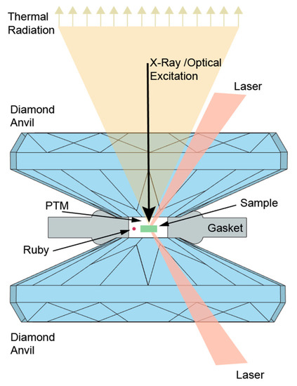 The principle of the LH-DAC has been thoroughly described in [61] and can be shown in Figure 2. The basic concept is based on a piston-cylinder mechanism, as the two opposing diamonds are approaching each other by the application of an external force which can be generated by screws or an external membrane. The sample is confined within a metallic gasket [184], usually made by stainless steel, rhenium, or tungsten, although composite gaskets such as amorphous boron-epoxy [185] or c-BN [186] also exist and can maximize the thickness of the sample chamber during the experiment. Alternatively, beryllium gaskets are used in the case both axial and radial access in the DAC is needed [187,188]. A pressure transmitting medium (PTM) is used to fill the sample chamber and offer the best hydrostatic conditions possible. The sample irradiation is performed with an IR laser source that accesses the sample by taking advantage of the transparency of the diamonds. The emitted thermal radiation passes through the diamonds and is guided to the entrance of a spectrometer, where it is analyzed in order to provide the temperature measurement (Section 3.3.3).