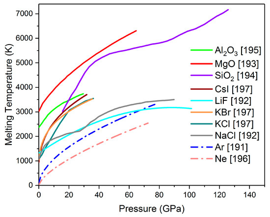 Several PTM have been used in diamond anvil cells, including liquids (methanol–ethanol mixture, methanol–ethanol–water mixture, silicon oil, Daphne 7373 or 7474, fluorinert), soft solids (CsCl, NaCl, KCl, KBr, LiF), hard solids (Al2O3, MgO, SiO2), or condensed gases (He, Ne, Ar, N2), He being by far the most hydrostatic of them all [190,191]. However, He is not used in high temperature studies, since it can escape the DAC in its gaseous form at high temperatures. Moreover, the choice of a PTM in melting curve ex-periments is mainly based on three factors: (a) the PTM has to stay insulating at high pressures and temperatures; (b) it has to be inert with the sample or the diamond anvils; and (c) it has a melting curve that is steeper than the material that is being studied (Section 5.3). By taking all this information into account, solid media such as NaCl, KCl, Al2O3, SiO2, or MgO and noble gases such as Ar or Ne are the PTM that are mostly used in a laser heating melting experiment. Figure 3 gathers together all the experimentally established melting curves of the most commonly used PTM inside an LH-DAC [192,193,194,195,196,197,198].