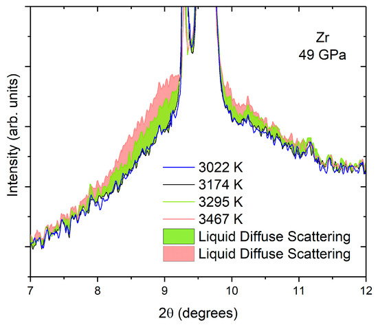 XRD patterns of a Zr sample in an LH-DAC [37]. The liquid diffuse scattering appears at melting as a background signal that increases in intensity with temperature as the quantity of the liquid increases. The light green liquid diffuse scattering background corresponds to 3295 K, the pink one to 3467 K. The patterns at 3022 K and 3174 K correspond to solid Zr.
