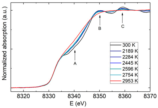 X-ray absorption near edge structure (XANES) spectra for Ni at different temperatures (reproduced from [39]). The melting can be determined by the disappearance of the shoulder in point A and the flattening of the first few oscillations (points B and C).