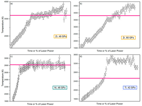 Comparison of temperature versus laser power curves in different samples and different heating runs: (a) Zr at 49 GPa [37], (b) Zr at 80 GPa [37], (c) Ni at 46 GPa [84], (d) Ti at 42 GPa [36]. In all of these works, the melting was determined by XRD liquid diffuse scattering (Section 4.2), and the melting temperature found at the given pressure is shown by the straight pink line.