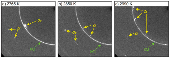 Figure 4 presents an example of the solid–liquid transition upon laser heating in Zr [37] using XRD. The diffuse liquid scattering appears at a given temperature and progressively dominates the diffraction signal upon further heating, while at the same time, the solid contribution decreases, indicating that the quantity of liquid in the sample increases with temperature. In this experiment, the XRD patterns did not exhibit any parasitic phases, such as ZrC or ZrO2.