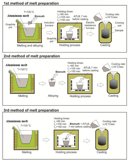 In the first method, bismuth was added to the melt in the induction melting furnace and melted for another 30 min, transferred to the holding furnace, and cast after different holding times. In the second method, bismuth was added to the melt during transfer into the holding furnace and cast after different holding times, and in the third method together with the grain refiner AlTi3B1 in the holding furnace exactly 7 min before casting. In all cases, the holding times at 720 °C were 60 min, 105 min, and 150 min.