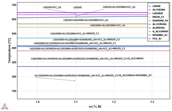 3.3. Calculation of Isopleth Phase Diagram of AA6026 Alloy with 1.1 wt.% Bismuth with Themo-Calc Software