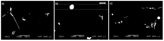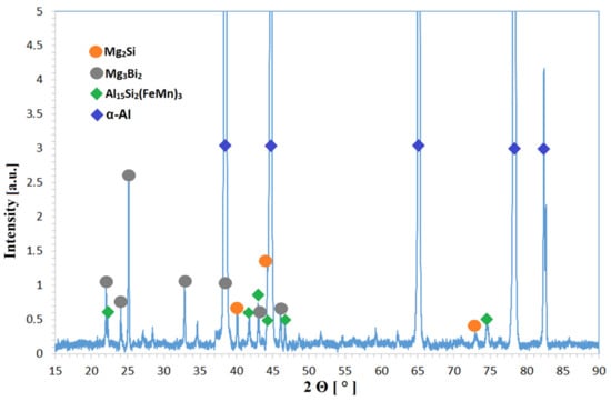 XRD (Figure 4) and SEM analysis (Figure 5) showed that the same phases (α-Al, Al15Si2(FeMn)3, Mg2Si, and Mg3Bi2) are present in the microstructure regardless of the melt preparation method used. For the XRD analysis the PANalytical, X’Pert PRO instrument was used, equipped with Empyrean X-ray tube and Cu Kα target, without the monochromator (Kαa X-rays: 0.15418 nm). The amount of all other phases that might have existed were below the detection limit of the XRD method (≈3 vol.%).