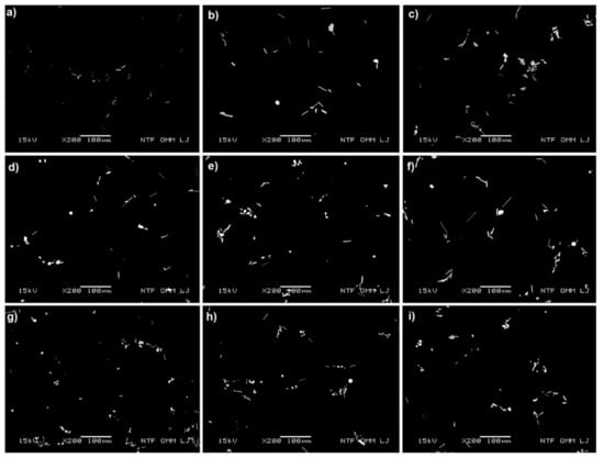 Microstructure of the samples (BEI). Mg3Bi2 phases (bright areas) (a) 1M60, (b) 1M105, (c) 1M150, (d) 2M60, (e) 2M105, (f) 2M150, (g) 3M60, (h) 3M105, and (i) 3M150.