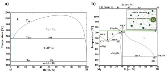 Phase diagrams: (a) Al-Bi []; (b) Mg-Bi (modified from ref. []).