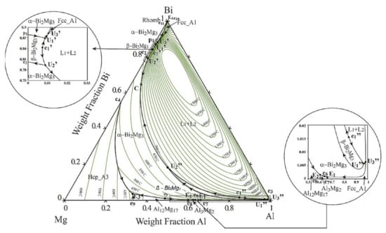 - Raghavan, V. Al-Bi-Mg (Aluminum-Bismuth-Magnesium). J. Phase Equilibria Diffus. 2011, 32, 448–450. [Google Scholar] [CrossRef]