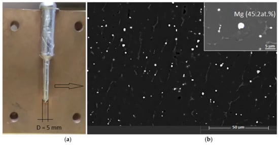 To prove that Bi-rich melt can be enriched with magnesium, we performed an experiment in which the melt (2M60) had been solidified in a copper mold at a high cooling rate (≈700 °C/s) (Figure 9a).