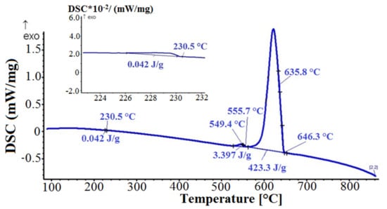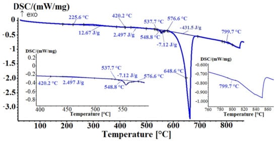 The DSC heating curve (Figure 10) shows a small exothermic peak in the temperature range between 225.6 °C and 420.2 °C, which can be attributed to complex sequential precipitation of the transition and Mg2Si phases or reformation of binary eutectic (Bi + α-Mg3Bi2). The first endothermic peak was visible in the temperature range between 537.7 °C and 576.6 °C, indicating melting of the Mg2Si phase. The largest endothermic peak corresponds to melting of the (α-Al + α-Mg3Bi2), (α-Al + Al15Si2(FeMn)3) and α-Al solid solution. Further, a small endothermic deviation on the curve could be seen at 799.7 °C, which indicates the presumed dissolution of the primary β-Mg3Bi2 phase. The DCS heating curves of the other two samples (2M105, 3M60) showed a similar pattern, with distinctive endothermic deviations at 797.2 °C and 783.7 °C.