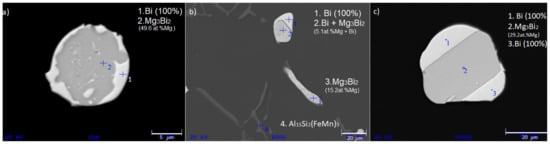 The cooling DSC curve is shown in Figure 11. The first exothermic peak corresponded to the solidification of the primary α-Al phase and the solidification of the heterogeneous structures (α-Al + Al15Si2(FeMn)3) and (α-Al + α-Mg3Bi2). The second exothermic peak indicated the precipitation of the Mg2Si phase. The solidification ended with the formation of a low melting point divorced eutectic (Bi + α-Mg3Bi2) at 230.5 °C, which was also confirmed by the microstructural analyses shown in Figure 12. Namely, α-Mg3Bi2 phase plate-shaped particles, rounded divorced eutectic structures (α-Mg3Bi2 + Bi), with high Mg content, and spherical particles with practically stoichiometric eutectic composition were found in the microstructure. Interestingly, no such divorced eutectic was observed in the microstructure of cast samples, regardless of the melt preparation method used. According to the equilibrium Mg–Bi phase diagram (Figure 7b) the eutectic (Bi + α-Mg3Bi2) forms at 260 °C (4.3 at.% Mg), whereas in DSC remelted samples bismuth droplets solidified as divorced eutectic with hypoeutectic composition (Mg-Bi system) or as primary Bi phase and Mg-Bi eutectic with equilibrium composition (hypereutectic composition in Mg-Bi system). The cooling curves of the other two samples showed a similar DSC pattern and microstructure with a slight temperature shift of the exothermic peaks. With DSC analyses we did not detect solidification of the primary β-Mg3Bi2 phase during cooling, neither its melting during repeated heating of DSC samples.