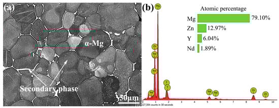 The typical microstructure of the heat-treated Mg–Zn–Y–Nd alloy is presented in Figure 1. It can be found that heat-treated alloy mainly contains α-Mg and secondary phase, as shown in Figure 1a. The secondary phase could be divided into two kinds. One kind of secondary phase is large and mainly distributed along the grain boundary, which forms the skeleton structure. The other kind of secondary phase is small and mainly distributed inside the grains. Moreover, the matrix also has a dual-size grain structure. It seems that the coarse secondary phase prefers to form along the small grain boundary. Based on the previous research [17,18], these secondary phases and precipitates in the Mg–Zn–Y–Nd alloy should be mainly W-Mg3Zn3Y2 phase or I-Mg3Zn6Y phase. Moreover, the Zn/(Y+Nd) ratio could be used to distinguish the W phase and I phase. In the present study, the Zn/(Y+Nd) ratio of the nominal alloy composition is less than two, as shown in Figure 1b. Considering the influence of solid solute Zn in matrix, the Zn/(Y+Nd) ratio of the secondary phase is be much lower than two, so the secondary phase is more likely to be W-Mg3Zn3Y2.