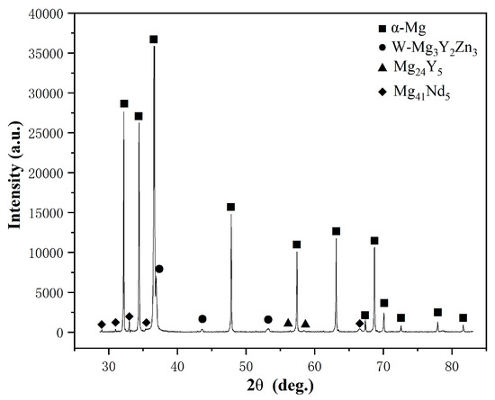 (1) In the heat-treated alloy, the semi-continuously distributed W-Mg3Zn3Y2 phases form the skeleton structure which separates the α-Mg matrix into a dual-size grain structure. In addition, the Mg24Y5, Mg41Nd5 and Y2O3 phases were also observed in the heat-treated alloy. Moreover, it can be found that the Mg24Y5 phase has orientation relationships with the α-Mg matrix of and , and the Mg41Nd5 phase has an orientation relationship with the α-Mg matrix of .
