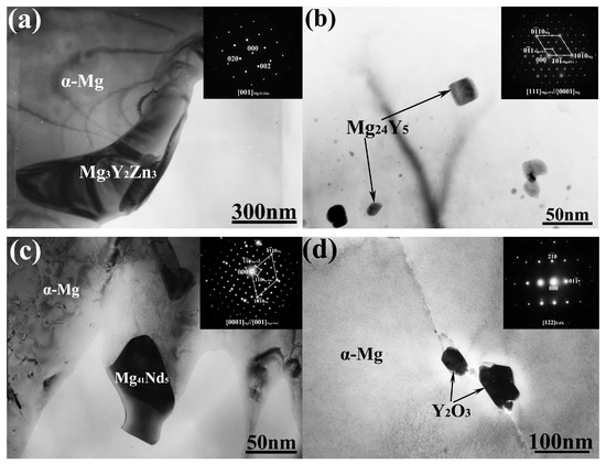 TEM observations on the heat-treated Mg–Zn–Y–Nd alloy reveal that the coarse secondary phase along grain boundary is the Mg3Y2Zn3 phase, as shown in Figure 3a. The inset selected area electron diffraction (SAED) pattern confirms the formed Mg3Y2Zn3 phase with the space group of Fm3m and the face-centered cubic crystal lattice with a lattice constant of a = b = c = 0.6833 nm. The further characterization on precipitates inside the grain exhibits that some of them are the Mg24Y5 phase, as shown in Figure 3b. Combining with the inset SAED pattern, it can be determined that the Mg24Y5 phase has the space group of I-43m and body-centered cubic crystal lattice the with lattice constant of a = b = c = 1.1204 nm. In addition, the SAED pattern also reveals that the Mg24Y5 phase has orientation relationships with the α-Mg matrix, which can be described as and . Such orientation relationships agree with the previous research [19]. In addition, the Mg24Y5 phases in the grain have different sizes. One is about ten nanometers and the other is about several nanometers. The TEM observation on the grain boundary also shows the Mg41Nd5 precipitate which has the space group of I4/m and the tetragonal crystal lattice with a lattice constant of a = b = 1.476 nm and c = 1.039 nm, as shown in Figure 3c. Moreover, the SAED pattern also reveals that the Mg41Nd5 precipitate has an orientation relationship with the α-Mg matrix, which can be described as . Further observations revealed that there are some small particles, as shown in Figure 3d. Combining with the SAED pattern, it can be confirmed as the Y2O3 phase which has a primitive cubic crystal lattice and a space group of Ia3 with a lattice constant of a = b = c = 1.0604 nm. According to the previous research [20,21], the casting alloy would always be accompanied with oxidation, which is demonstrated as the oxide particle or oxidation film. In the present study, the activity of the Mg would inevitably involve oxygen, which is able to react with the rare earth element during the metallurgy and casting process. The formation of this kind of Y2O3 is beneficial to the grain boundary strength by capturing impurities and decontamination of the boundary.
