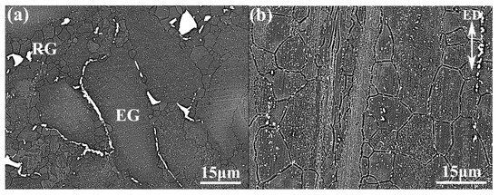 SEM micrograph of the Mg–Zn–Y–Nd alloy with one-pass hot extrusion: (a) cross-sectional microstructure showing the dual-size grain structure, (b) longitudinal–sectional microstructure showing the elongated grain structure (RG: recrystallized grain, EG: elongated grain).