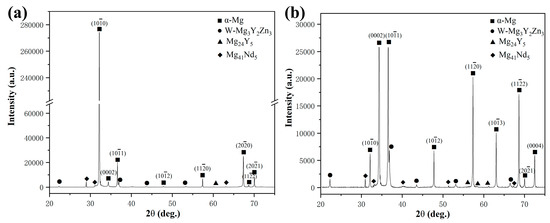 XRD patterns of the Mg–Zn–Y–Nd alloy with one-pass hot extrusion: (a) cross section of the extrude alloy (perpendicular to the extrusion direction), (b) longitudinal section of the extruded alloy (parallel to the extrusion direction).
