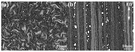 The typical SEM micrographs of the Mg–Zn–Y–Nd alloy with two-pass hot extrusion are shown in Figure 6. Clearly, the two-pass extrusion has refined the grain significantly. The cross-sectional microstructure of the two-pass hot extruded alloy exhibits the ultrafine grain with average size of about 4 μm, as shown in Figure 6a. Except for the ultrafine grain, the two-pass hot extrusions also optimize the secondary phase by uniform redistribution and size refinement. The longitudinal–sectional microstructure of the two-pass hot extruded alloy shows that the gray structures are the grains elongated along the extrusion direction, as shown in Figure 6b. In addition, most of the gray structures are parallel to each other with thickness from 3 to 7 μm. Such a structure might be inherited from the elongated grain in the one-pass extruded alloy. Compared with the one-pass extruded alloy, the secondary phases along the grain boundary become finer and tend to be spheroidizing. Different from the uniformly distribution on cross section, the secondary phases still linearly distribute along the extrusion direction in the longitudinal section and they mainly locate in the region of recrystallized grains.