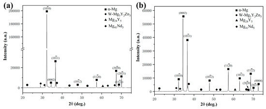 XRD patterns of the Mg–Zn–Y–Nd alloy with two-pass hot extrusion: (a) cross section of the extrude alloy (perpendicular to the extrusion direction), (b) longitudinal section of the extruded alloy (parallel to the extrusion direction).