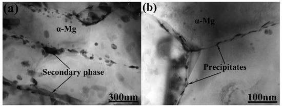 TEM observations were performed on the Mg–Zn–Y–Nd alloys with one-pass and two-pass extrusion and the results are exhibited in Figure 8. It can be seen that one-pass hot extrusion resulted in great deformation in the secondary phase and matrix, as shown in Figure 8a. The secondary phases have broken into small ones with irregular shape and most of them exhibit linearly distributing morphology. Moreover, there are some phases with near spherical shape are distributed in the matrix, which is separated by the linearly distributed secondary phases. Such morphology of the secondary phase contributes to the recrystallization and grain refinement [26]. Additionally, the linearly distributed secondary phases act as the grid which refines the matrix into ultrafine grains. The TEM observations on the two-pass hot extruded alloy demonstrate that there are small particles along grain boundaries, as shown in Figure 8b. Based on the morphology, most of the particles along the grain boundary should be precipitates which form during the two-pass hot extrusion processing. According to the previous research [27], the Y would have more than 6 wt.% solid solubility in Mg at temperatures above 400 °C. Then, the heat treatment before the hot extrusion would promote the solid solution of the alloying element and the subsequent precipitation during the hot extrusion. In addition, the boundary, substructure and crystal defect would provide the site for nucleation of precipitates. Therefore, it can be seen that there are some new small diffraction peaks in the XRD patterns of the hot extruded alloy, compared with the heat-treated alloy.