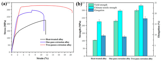 The tensile true stress–true strain curves and mechanical properties of the heat treated and hot extruded Mg–Zn–Y–Nd alloys are shown in Figure 9. It can be found that the Mg–Zn–Y–Nd alloys with different states almost exhibit similar tendency in that the plastic deformation is after the yielding, as shown in Figure 9a. However, the Mg–Zn–Y–Nd alloys with different states demonstrate different plastic deformation behaviors. The heat-treated Mg–Zn–Y–Nd alloy exhibits continuous work hardening with the stress obviously increasing. For the Mg–Zn–Y–Nd alloy with one-pass extrusion, its stress increases slowly and there is a jump at the half stage of plastic deformation. While the Mg–Zn–Y–Nd alloy with two-pass extrusion almost has no increase in stress after yielding. The detailed mechanical properties indicate that the extrusion process has improved the strength and ductility of the alloy obviously, as shown in Figure 9b and Table 2. The elongation (E), yield strength (YS) and ultimate tensile strength (UTS) of the heat-treated alloy are 9.5%, 105 MPa and 230 MPa, respectively. With the one-pass extrusion processing, the alloy obtains the E, YS and UTS of 9%, 225 MPa and 295 MPa, respectively. Compared with the heat-treated alloy, the one-pass hot extrusion enhanced the YS and UTS of the alloy by about 115% and 30%, but the EL decreased a little. After the two-pass hot extrusion, the elongation, YS and UTS of the alloy reached 17.5%, 300 MPa and 330 MPa, respectively. Compared with the heat-treated alloy, the two-pass hot extrusion processing increased the E, YS and UTS by about 85%, 180% and 45%, respectively. Different from the one-pass hot extrusion, the two-pass hot extrusion greatly improved the ductility and strength simultaneously. Such an improvement should be ascribed to the microstructure optimization. The fine grain and secondary phase should be the main factors that influence the strength and ductility. Combining with the microstructure observation, it could be concluded that the strength improvement of the one-pass hot extruded alloy should be mainly ascribed to the partly refined grain and secondary phase. However, the relative coarse elongated grain and semi-continuously distributed secondary phase also are detrimental to the ductility. The two-pass hot extrusion thoroughly refines the grains and redistributes the secondary phase uniformly. Therefore, the alloy with two-pass hot extrusion obtains great improvement in strength and ductility.