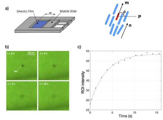 (a) Left: Scheme of the film holder mounted on the microscopy table. Right: Schematic of the dye orientation drawn in red in the nematic matrix drawn in blue. is the nematic director, is the transition moment, and is the polarization plane of the excitation beam. (b) Snapshots from the experiment showing the fluorescence intensity recovery of a bleached region (exposed for 8 s to full laser power before ). The film does not contain defects in the vicinity of the region of interest (ROI). (c) Time dependence of the measured mean intensity of the bleached ROI presented in Figure 1b. The recovery time is about 10 s. The dashed line is an exponential fit.