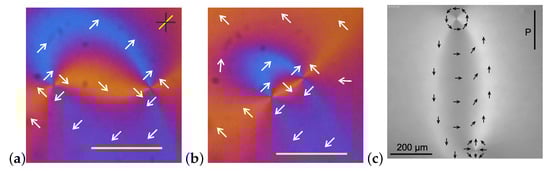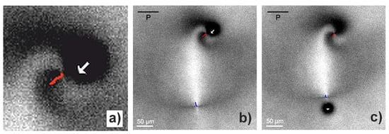 Comparison of the experimental data with the numerically predicted flow field [24] (Figure 6b) shows good qualitative agreement. Note, however, that the backflow is not necessarily towards the opposing defect if there is a mismatch in the pair. The direction of the backflow is determined by the direction of motion of the defect.