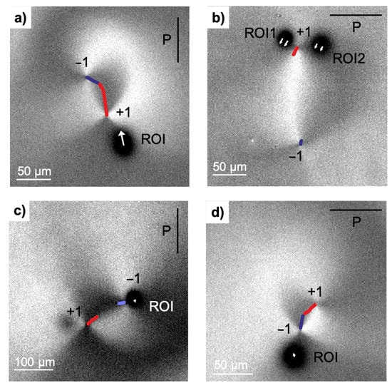Figure 3 shows snapshots of four defect pairs together with their bleached spots. The textures of the pairs and the ROI are seen at the beginning of the recording, immediately after bleaching stopped. The defect trajectories are represented by blue (for the defect) and red (for the defect) curves. The time interval during which these trajectories were recorded are approximately 8 s. We have performed experiments with single and double bleached spots (Figure 3a,b, respectively). The flow velocities can be estimated from the analysis of the ROI spots and are given by the arrows.