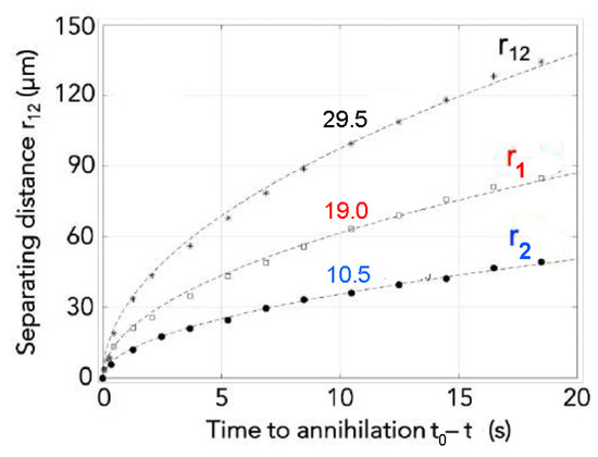 Actual defect velocities can be found in the experiment from the defect positions. For that purpose, we analyzed longer trajectories without the bleaching technique. The distances of the defects from the annihilation center and their mutual distances are shown in Figure 4 for a matching pair. The mutual approach occurs along a straight trajectory. In good approximation, the positions of defect i can be fitted to square-root laws (dashed lines), and their distance is given by . This corresponds to a velocity . It is obvious from these equations that the observed velocities and of the individual disclinations must relate to each other like the coefficients and . The defect is found to move nearly twice as fast as the defect. If we assume that the reason for that difference is backflow coupling and advection, with no significant flow near the defect, then it is natural to equate to in Equation (1). The difference of and is then a signature of flow near the defect.