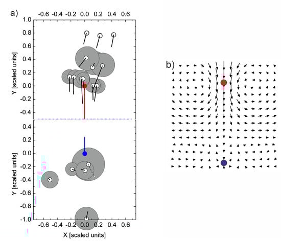 A similar procedure was performed near the defect. Here, the area was scaled again in units of the defect distance, the coordinates were rotated such that the defect moves upward (like in the simulated matching pair in Figure 6b). Velocities were scaled again, with the displacement of the defect. Errors were estimated in the same way as above. The blue circle is the position of the defect, the blue line its trajectory. Now, it can be seen that all black lines corresponding to the displacements of the ROIs are within the uncertainty limits of the experiment, so the observations are in agreement with the assumption of absent backflow.