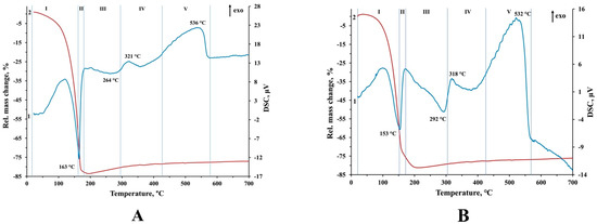 The results of TG-DSC analysis of liquid precursors E1 and E2 with different titanium concentrations are shown in Figure 1. According to the data presented, studied precursors demonstrate similar thermal behavior during the heating process. At the same time, the thermal effects are more pronounced for the precursor with higher titanium concentration (E2) and just these results (see Figure 1B) will be discussed in detail.