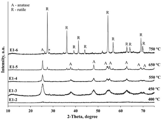 According to the XRD analysis (Figure 4, Table 1, samples E2-1–E2-6), the heat treatment of a more concentrated precursor E2 at 400 °C corresponds to the beginning of the anatase phase crystallization. Pyrolysis of the precursor at 550 °C and 650 °C leads to the gradual polymorphic transformation of anatase to rutile with a simultaneous increase in the mean crystallite size of anatase from ~20 nm to ~35 nm and of rutile from ~30 nm to ~45 nm, respectively. As a result of heat treatment at 750 °C, a monophase product consisting of a rutile polymorph with dR ~53 nm is formed.