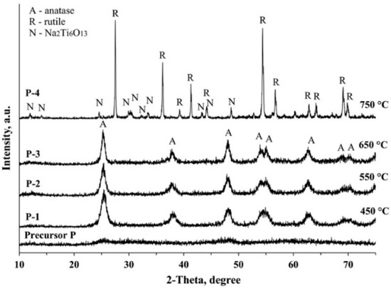 According to XRD analysis, precursor P is amorphous (Figure 5, Table 1). The anatase phase, produced as a result of the heat treatment of precursor P, is similar to these at the precursor E1 treatment at 450 °C and 550 °C. The increase of the processing temperature to 650 °C or 750 °C leads to the formation of two phases of TiO2. Moreover, depending on the heat treatment temperature, either anatase or rutile is a dominating phase (Figure 5, samples P-3 and P-4). It was also found two processes occur simultaneously at 750 °C: the polymorphic transformation of anatase into rutile and the crystallization of the admixture phase, Na2Ti6O13. This phase is a product of the interaction of NaOH with TiO2 at high temperatures, i.e., during the preparation of a precursor P, it is impossible to completely remove the residual amounts of NaOH by washing the precipitate (gel). In the case of the EPM, a system of two immiscible liquids is used, and the target product (titanium carboxylate) is dissolved in the organic phase, while water-soluble reaction components, in the aqueous phase. Hence, the presence of impurity phases in the TiO2 samples was not established (see Figure 3 and Figure 4).