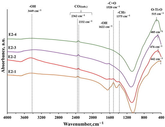 The FTIR spectra (see Figure 6) contain the peaks at 3449 cm−1 and 1622 cm−1, which correspond to the stretching and bending vibrations of–OH groups. Weak absorption bands at 2362 cm−1 and 2332 cm−1 in the samples are associated with the presence of carbon dioxide CO2 absorbed from the atmosphere [54]. In the case of the samples produced at 350 °C or 400 °C (Figure 6, samples E2-1 and E2-2), the spectra contain the absorption bands peaked at 1520 cm−1 and 1375 cm−1, which indicate the presence of undecomposed organic residue in these materials [55,56]. The presence of TiO2 in the studied materials is confirmed by a wide absorption band at ~1000 cm−1–400 cm−1 associated with the vibrations of Ti–O–Ti bonds in the TiO2 lattice [57,58]. In the mentioned spectral region, a shift of the maximum from 515 cm−1 to 442 cm−1 is observed upon the decrease in the precursor pyrolysis temperature from 550 °C to 350 °C (Figure 6, samples E2-4–E2-1). This fact may be related to the changes in the size of the produced TiO2 particles, as described earlier in [41,59]. This is also consistent with the results of our XRD analysis (Table 1), under which a decrease in the pyrolysis temperature of the precursor E2 in this temperature range leads to a decrease in the mean crystallite size of anatase from 20 nm to 5 nm, and, finally, to amorphization. Thus, according to our results, to produce organic impurity-free TiO2 powders via the EPM, the minimal pyrolysis temperature of the extracts (precursors E) should be 450 °C. The data obtained do not contradict the results of the TG-DSC analysis (Figure 1) presented above. A similar picture was observed at the comparison of the infrared spectra for bulk and nanosized AlN and LaPO4 [60,61,62].