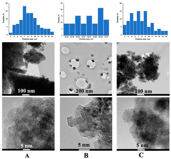 HR-TEM (a bottom raw), TEM (a medium raw) images and histograms of the particle size distribution (a top raw) of samples produced by the EPM (A,B) and precipitation method (C) at temperatures: (A)—450 °C (sample E2-3); (B)—750 °C (sample E2-6); (C)—450 °C (sample P-1).