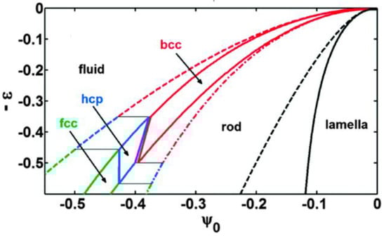Here ψ ∝ (ρ − ρ0)/ρ0 is the scaled density difference, whereas ε is the reduced temperature (normalized distance from the critical point). The latter can be connected to such physical properties as the bulk moduli of the fluid and crystalline phases at a reference density and temperature. The phase diagram of the 3D system is shown in Figure 1 [27,30,34]. Besides the homogeneous liquid, stability domains exist for the body-centered cubic (bcc), hexagonal close-packed (hcp), and face-centered cubic structures. With appropriate quenching procedure in the presence of noise representing the thermal fluctuations, amorphous solids of realistic radial distribution function g(r) can also be obtained in the vicinity of the linear stability limit of the liquid state [26,27,28,29,30].
