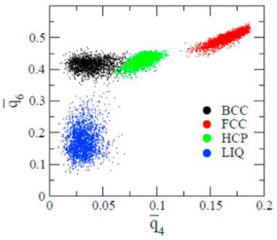 For reference, the – map evaluated for bulk bcc, hcp, fcc and liquid phases from molecular dynamics simulations performed for the Lennard-Jones (LJ) system is shown in Figure 2 [46]. This order parameter map distinguishes the bulk crystal and liquid structures reasonably well.