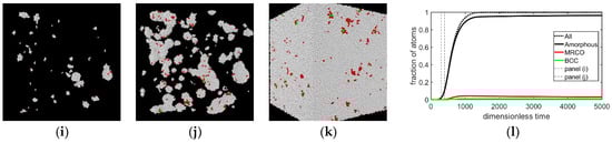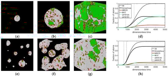 As expected, with increasing undercooling, increasing number of solid nuclei formed. Coloring according to the value of indicates that in all the cases studied, nucleation of the solid started with the formation of an amorphous structure, which was followed by the appearance of MRCO structure, whereas the stable bcc phase formed slightly later but almost together with the MRCO, indicating an essentially two-step process mediated by the amorphous precursor and MRCO structures, akin to that reported in previous work for diffusive dynamics [27,28,29,30]. This sequence is clearly displayed by the time dependence of the phase fractions presented in Figure 3d,h,l. One may conclude that under the conditions investigated, the kinetic preference that determines the sequence by which the different structures appear is similar for diffusion controlled and hydrodynamic solidification mechanisms.