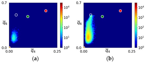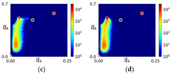 Snapshots of the – map displaying the transition from the initial amorphous state to the bcc crystal is shown in Figure 4 for the simulation depicted in Figure 3a–d. The position of the initial amorphous domain agreed well with the liquid domain in the – map for the LJ system (see Figure 2), suggesting structural similarity between the sHPFC amorphous phase and the LJ liquid. This behavior is very similar to the one reported for DPFC [29]. Unfortunately, the – map does not give a detailed characterization of the structure. Therefore, we further investigated the structures appearing during early-stage solidification.