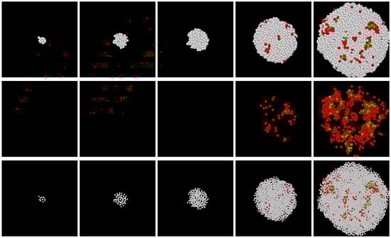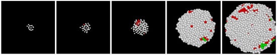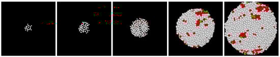 First, we investigate whether the amorphous-precursor-assisted crystal nucleation [26,27,28,29,30] observed in the DPFC model prevails in the sHPFC model. We have performed isothermal simulations for scaled density of ψ0 = −0.2720 at reduced undercoolings of ε = 0.200, 0.202, and 0.204. Snapshots of these simulations taken at different instances are shown in Figure 3, showing nucleation and post-nucleation growth.