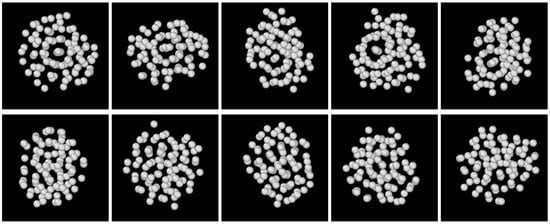 Sequences of snapshots of atom assemblies formed preceding crystallization are shown in Figure 5, Figure 6 and Figure 7. Apparently, non-crystalline structures formed first; however, with some degree of ordering, there were directions from which concentric ring-like arrangements of atoms could be seen, while viewing from some other directions, definite ordering could not be recognized. This structure occurred frequently in the DPFC, MPFC, and sHPFC simulations. During further evolution of the solid cluster, a mixture of non-crystalline order and liquid-like disorder appeared. Coloring according to the magnitude of did not separate these two types of solid structures. We have employed other structural characterization methods such as polyhedral template matching; however, besides a somewhat higher fraction of icosahedral-like neighborhoods than in the LJ liquid, no conclusive results were obtained for such mixture. Finally, it is worth mentioning that a DFT study indicates “onion” structures [48] as possible initial perturbations in the pre-solidification liquid; however, it does not seem to be related to the ring-like structure observed here, which might indicate ordering in a lower dimension (2D). A couple of different views of the same early-stage cluster are presented in Figure 8. Remarkably, a mixture of order and disorder is present. Whether these structures are akin to the icosahedral aggregates predicted by Dzugutov and coworkers [49,50], using a potential similar to the effective pair-potential we derived for the PFC model [28], is unclear at present. Work is underway to clarify further the nature of the non-crystalline ordering observed during the early stage of solidification.