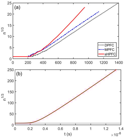 An effective linear size (n1/3) was evaluated as a function of time from the number n of density peaks for the DPFC, MPFC, and sHPFC clusters shown in Figure 5, Figure 6 and Figure 7, respectively. The results are shown in Figure 9a, whereas the prediction for pure Fe at 1500 K obtained by integrating Equation (1) is shown in Figure 9b. It is found that predictions of the three models for post-nucleation growth were qualitatively similar: after a plateau corresponding roughly to the critical size, a smooth transition into an apparently steady-state growth was seen. In the case of the DPFC model this probably indicates that the system entered the fast diffusionless growth regime. The transition to steady-state growth was somewhat longer for the sHPFC model than for the other two. The differences in the growth mechanisms, according to the three models, were perceptible only for longer time scales.