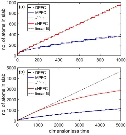 Flat-interface slab growth in 3D within the DPFC, MPFC (α = 1 and β = 0), and the sHPFC model (α = 0 and β = 1). The number of atoms in the crystalline slab is shown as a function of dimensionless time for (a) short times and (b) long times. A linear function fitted to the sHPFC result for t < 500, and an Aτ1/2 function fitted to the DPFC result for τ < 5000 are also shown (dotted lines).
