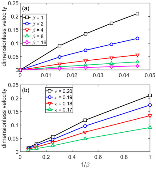 Next, we evaluated the steady-state growth rate as a function of driving force and viscosity in the sHPFC model. As in the case of the HPFC model that relies on full fluctuating nonlinear hydrodynamics, it was found that the steady-state velocity vs. reduced undercooling Δε = ε − εL plot was somewhat curved (see Figure 11a) as reported for the MPFC model [51], which may follow either from a deviation from Turnbull’s linear relationship for the thermodynamic driving force [52], or may originate from a relaxation effect Ankudinov and Galenko identified in the case of the MPFC model [53]. The growth velocity, in turn, is about inversely proportional with the viscosity term β (see Figure 11b).
