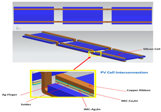 Figure 4 presents the architecture of a conventional c-Si PV cell interconnection. The conventional cell-to-cell interconnection architecture of a c-Si PV module involves connecting solder-coated copper (Cu) ribbons in a series arrangement. The ribbons connect the silver (Ag) electrodes deposited in the silicon crystal via solder bonds. These materials forming the interconnections (Ag-finger-solder-IMCs-copper ribbon) of the module have different co-efficients of thermal expansion (CTE). Park et al. [