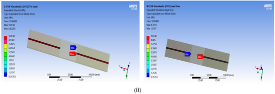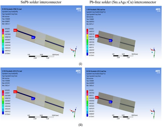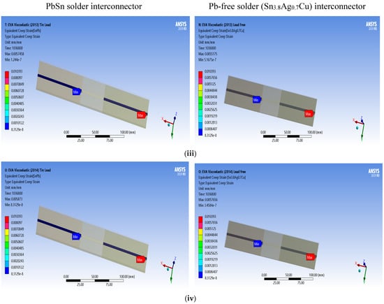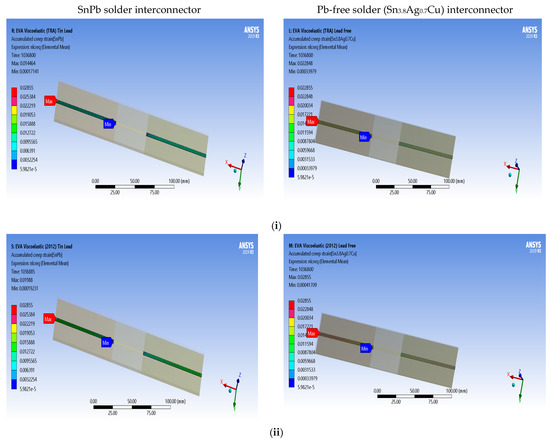 Figure 11ii) in the SnPb solder interconnection during the 2014 thermal load cycle. Overall, the 2012 thermal cycle induced the maximum accumulated creep strain in both interconnections (0.01988 mm/mm for SnPb solder and 0.028555 mm/mm for Pb-free).