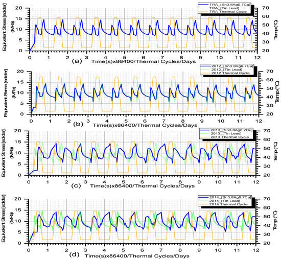 The equivalent von-Mises stress response in the solder over the 12 thermal cycles (TRA, 2012, 2013 and 2014 thermal cycles) presented in